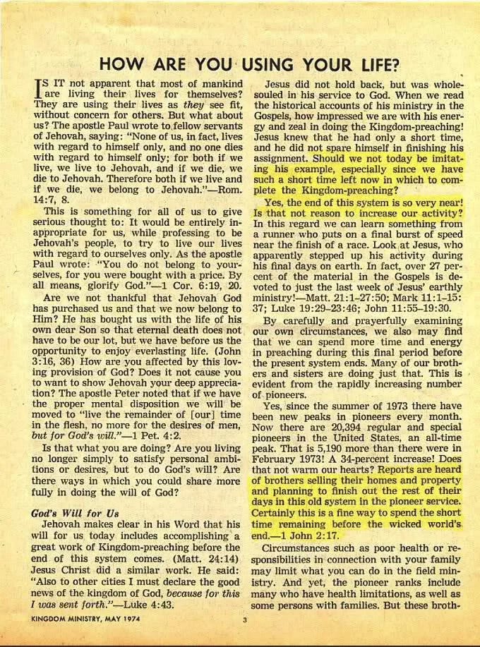Each deadline dissolved into silence. Followers quit jobs, skipped college, sold homes, delayed medical treatment, and structured their lives around these ticking clocks. When 1975 came and went, many Witnesses quietly left, but the organization survived by moving the finish line yet again. “The end is near” became a permanent state of mind, a doctrine of perpetual imminence.